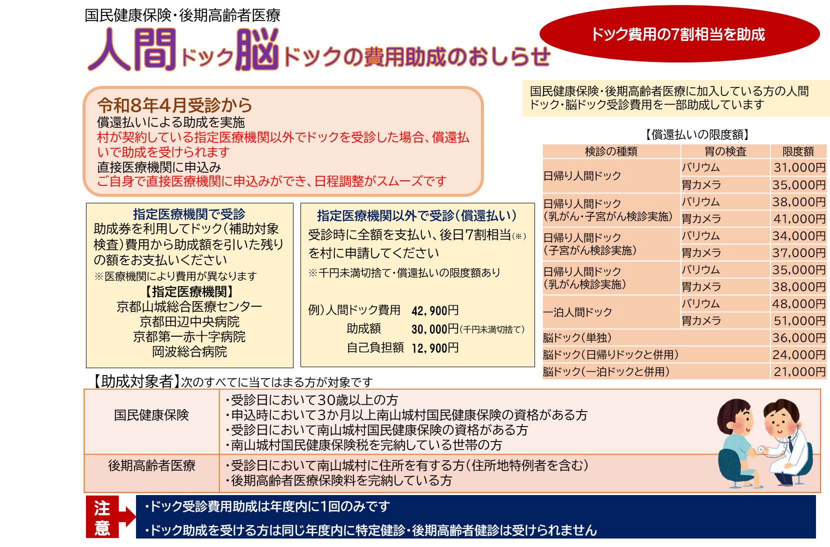 予約時に村の国民健康保険または後期高齢者医療のドック利用の旨をお伝えください
