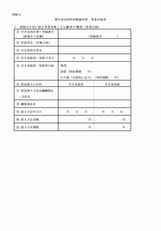 第4条 事業を実施しようとする補助対象者(以下「申請者」という。)は、事業に着手する前に、南山城村空き家活用移住促進事業補助金交付申請書(別記第1号様式)に関係書類を添えて村長に提出しなければならない。