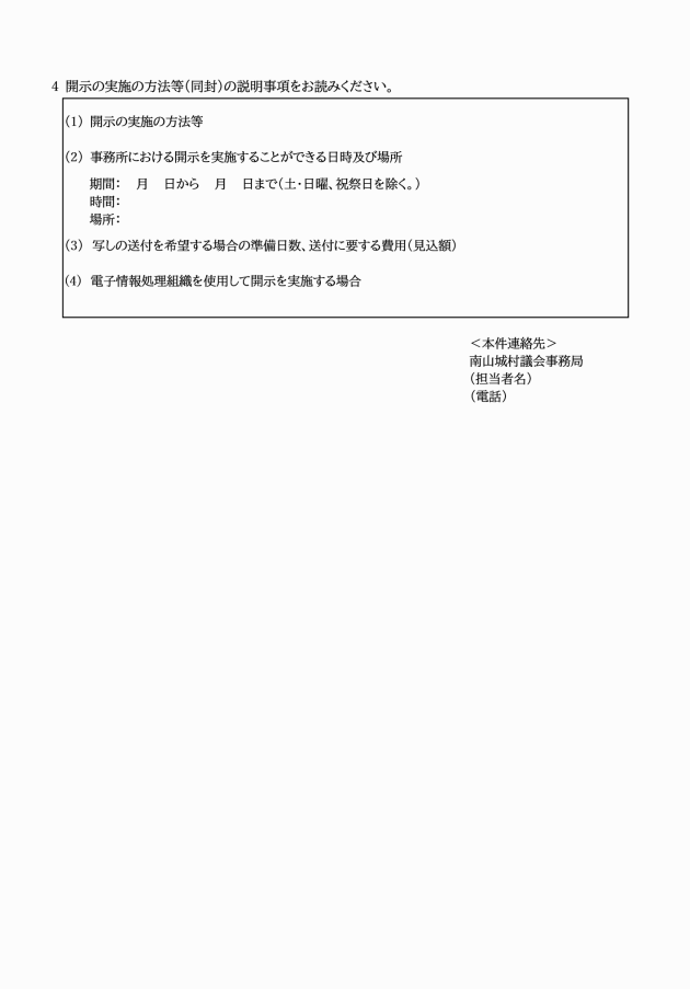 (2) 事務所における開示を実施することができる日、時間及び場所並びに事務所における開示の実施を求める場合にあっては、条例第28条第3項の規定による申出をする際に事務所における開示を実施することができる日のうちから事務所における開示の実施を希望する日を選択すべき旨