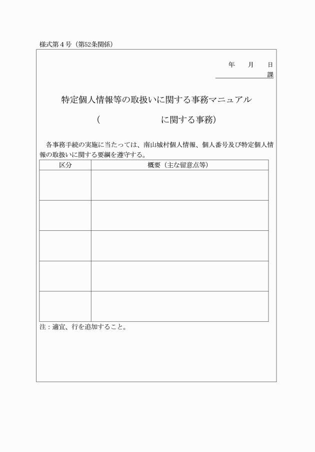 第52条 総括保護管理者、保護管理者等は、個人番号利用事務等の範囲等を明確にした上で、特定個人情報等の取扱いに関する事務マニュアル(様式第4号)により個人番号利用事務等の流れを整理し、管理段階ごとに安全管理措置を織り込む。